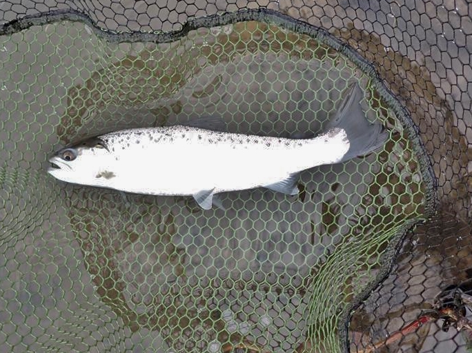 Sea trout smolts can be identified from their silvery appearance and eyes that are slightly larger than a resident brown trout. These fish, nearly all females, are migrating downstream to the sea to feed, they will return as mature sea trout.