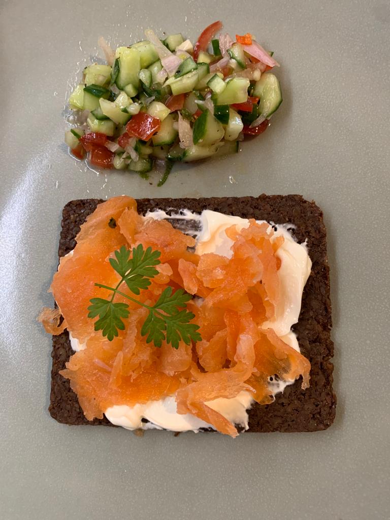 This appetizer was created using a brown trout from Lower Bognor. It was cured for two days and served with creme fraiche on pumpernickel bread with a cucumber, tomato and shallot salsa.