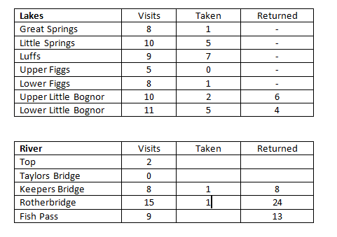 Lakes – the warm weather and consequent increase in water temperature (all rainbow lakes are now over 19 degrees C) has meant the suspension of catch and release on the rainbow lakes. This is an opportunity to visit the spring fed lakes at Little Bognor or the river where catch and release is still permitted.