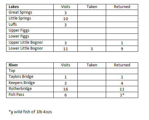 “… members have been having most fun at Little Bognor and on the river. The wild brown trout of 1.25 lbs from Beat E was special, both as a perfect fish in its own right and for the member who caught it. The fish was the highlight of his season so far, he caught it on a black and red flash damsel.” – Andrew Thompson