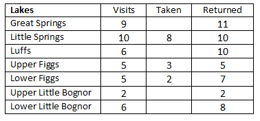 Rainbows of 6lb and 4lb 8ozs were caught from Luffs and Upper Figs respectively. A brown trout of 5lbs was caught and returned at Little Bognor.