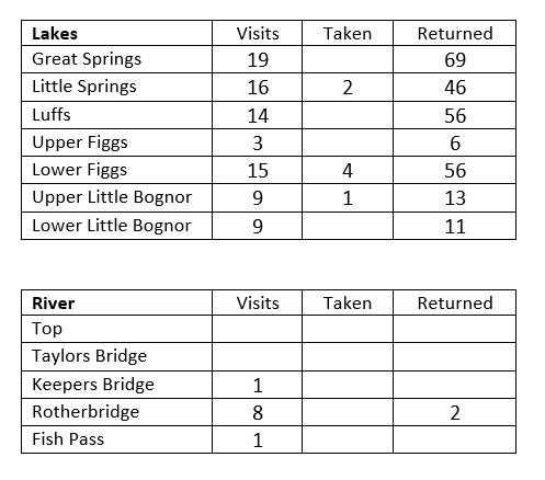 “An excellent week on the lakes but we are having to postpone Sundays river day as both river and bank conditions will be far from ideal. The river is flooded now and although this water will drop in the coming days, further heavy rain is forecast for Thursday. The river will, unfortunately, almost certainly be at bank-full or over again for this weekend.”