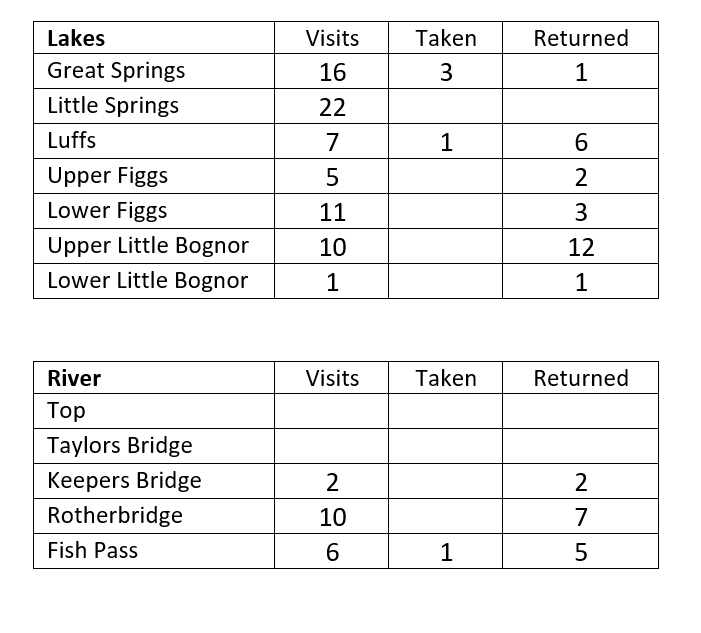 “Fishing is becoming more challenging on the rainbow trout lakes as the summer progresses. ‘Catch and Release’ on these lakes has now finished until the autumn. At the brown trout lakes and river, returns remain steady and ‘Catch and Release’ remains an option.