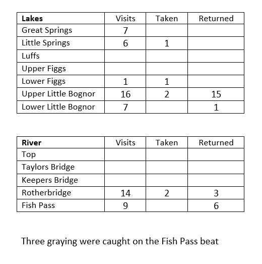 “The Little Bognor lakes and the river continued to provide good sport. Successful flies included: black spider, black Klinkhammer, black gnat, Perdigon, daddy, suspender buzzer, sedge, damsel nymph, mayfly and butcher. A good run of sea trout was evident last week.”