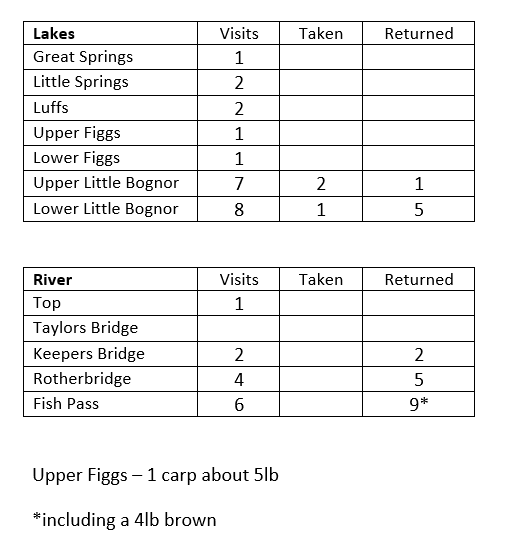 Fish were rising freely at Little Bognor but the weekend rain and the sudden change in the water temperature, slowed down the fishing. I used a black gnat and cast to cruising fish.