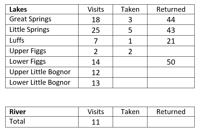 Whilst the rainbow trout lakes continued to fish well, the brown trout ponds became more challenging. The river continued to be extra challenging, with only a few tugs so far. Even with the current frosty mornings, large numbers of sand martins are now working the river meadows, indicating increasing fly-life.