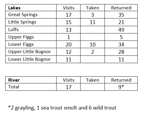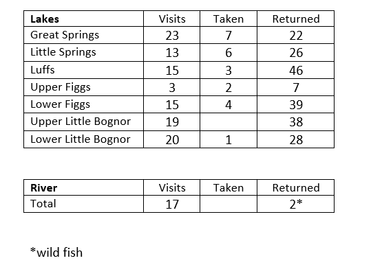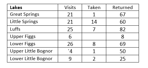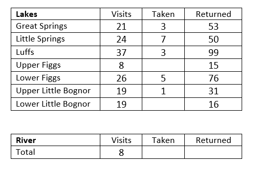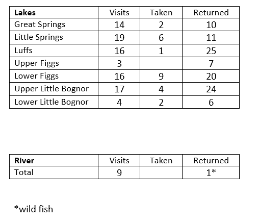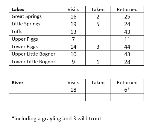 The period of fine, settled weather provided good conditions and opportunities for all, with 47 members catching 168 fish over the first two days. Popular flies included GRHE, PTN, both black and white nymphs, blue flash damsel and daddy long legs.” – Andrew Thompson